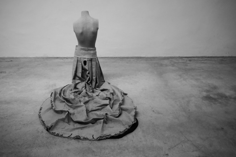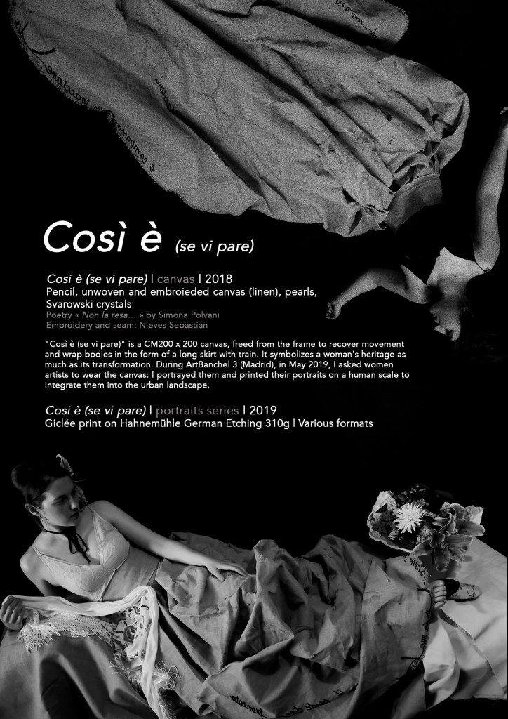 Così è (se vi pare), a 200 x 200 cm canvas, freed from the frame, recovers movement and wraps bodies in the form of a long skirt with train. It symbolizes a woman’s heritage as much as its transformation.